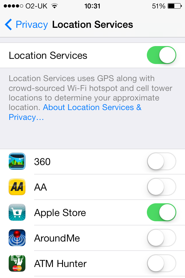 Go to Settings->Privacy->Location Services. In the image below you will see that I have the 360, AA, Around Me and ATM Hunter apps switched off and the Apple Store app switched on.