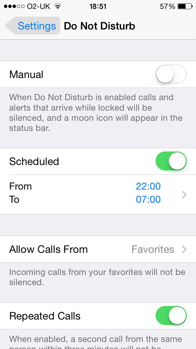 When Apple added the Do Not Disturb feature it meant I could schedule when I would like this turned on and off. I have it set to turn on at 10pm and then off so I can receive calls and text messages from 7am. What would be great, if anyone at Apple is listening, is to have it scheduled for different days so that on the weekend I can have it turn off this feature later.